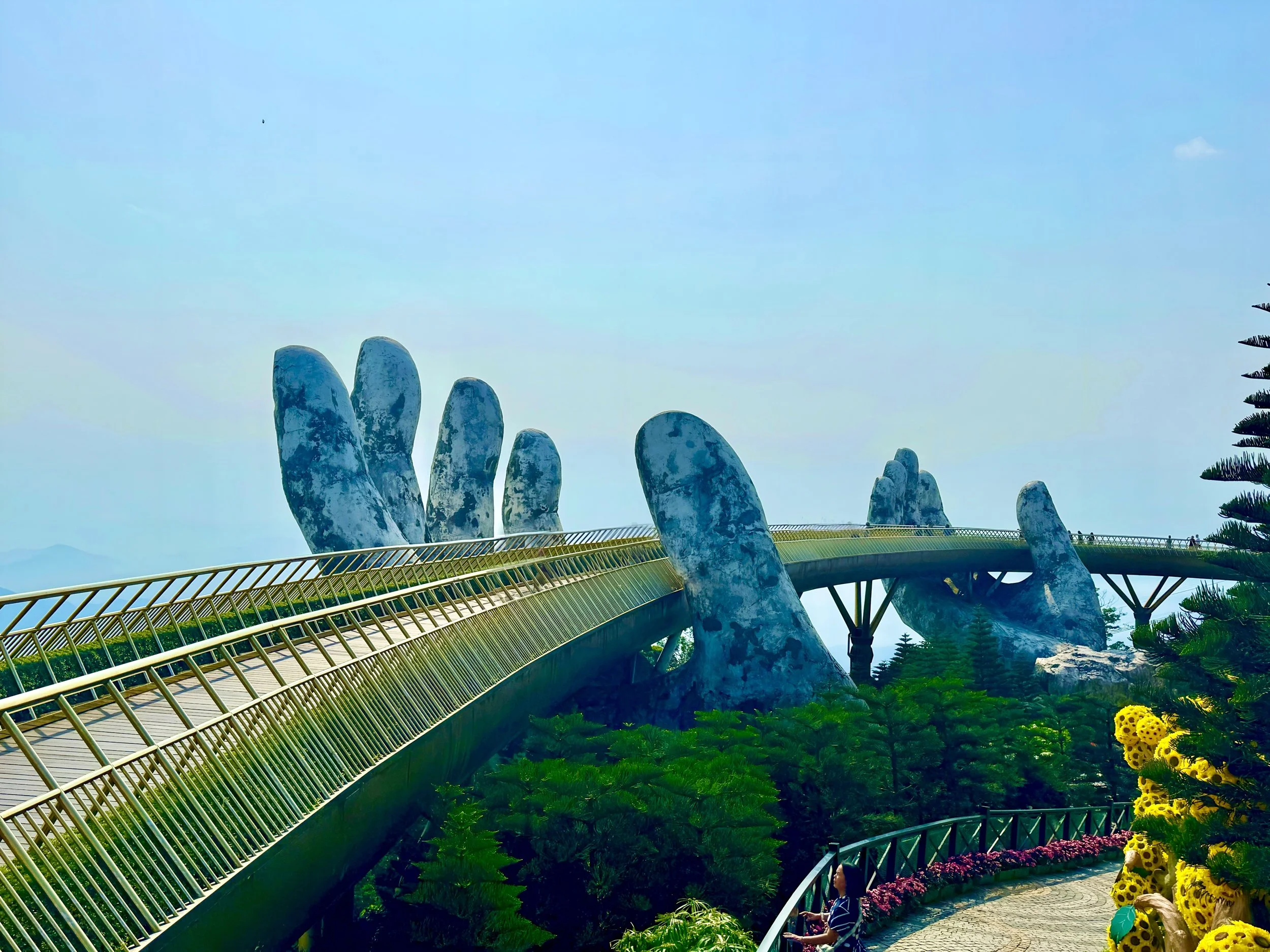 We’ll ride the world’s longest cable car into the clouds, cross the Golden Bridge held aloft by stone hands, and drive the Hai Van Pass — one of the most scenic roads in the world.